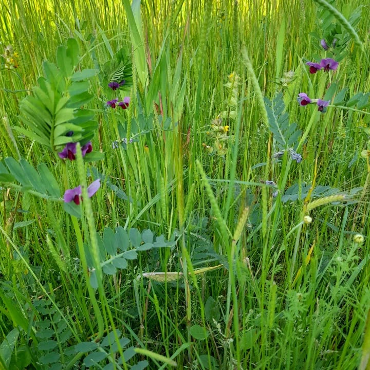 Anyway, speaking of grass, our endeavour to turn Triangle Field in to 5 acres of species-rich grassland is bearing fruit. Well, flowers. A quick recap… Before sowing in October 2023, we tested the soil for phosophorus which fortunately indicated that the fertility level was low. This was quite a surprise; for as long as we have known, the land was used for barley and this is conventionally fertilised quite heavily. Luckily the previous owner had not the time to fertilise last year and this has really helped us. The barley crop actually depleted the fertility in the soil, being as it is, a hungry crop, thus preparing the ground perfectly for a hay meadow. It’s essential to have low-fertility soil to establish a good meadow, rich soil just benefits the viorous grasses and the flowers and native grasses can’t compete.